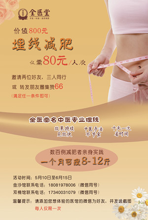 全医堂埋线减肥特推活动,三人成团或转发下图到朋友圈参与活动,超低折扣仅需80元尊享原价800元埋线减肥,还在等什么,快来体验吧~